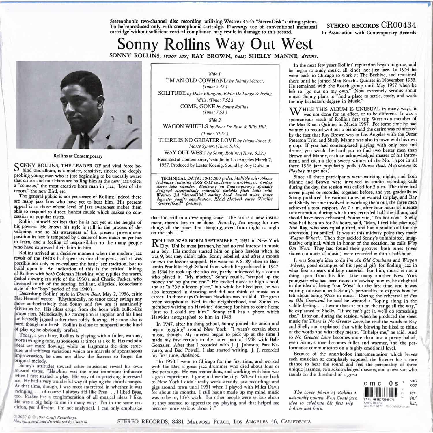 Illustré par une pochette iconoclaste représentant le saxophoniste ténor en cowboy, Way Out West s’ouvre au cool jazz en alternant originaux, standards et chansons de westerns, dont « Wagon Wheels » et « I’m an Old Cowhand (From the Rio Grande) » signée Johnny Mercer.